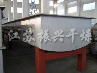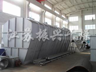 經(jīng)過(guò)濾器凈化過(guò)濾,冷凍除濕后的空氣在鼓、引風(fēng)機(jī)的作用下通過(guò)蒸汽換熱器換熱,經(jīng)渦旋熱風(fēng)分配器均勻進(jìn)入舌形孔板,與由全封閉皮帶輸送機(jī)輸送并經(jīng)拋散機(jī)分散后的濕物料進(jìn)行充分的熱交換,濕物料在熱風(fēng)的吹動(dòng)下呈沸騰狀態(tài)進(jìn)行傳熱、傳質(zhì)。濕氣經(jīng)擴(kuò)大體沉降,旋風(fēng)分離器分離、布袋除塵器、后經(jīng)引風(fēng)機(jī)達(dá)標(biāo)排放。數(shù)小時(shí)后已干物料在貼近孔板水平風(fēng)力和舌形孔板導(dǎo)流的作用下快速、徹底的向出料端移動(dòng)并進(jìn)入下段工序。